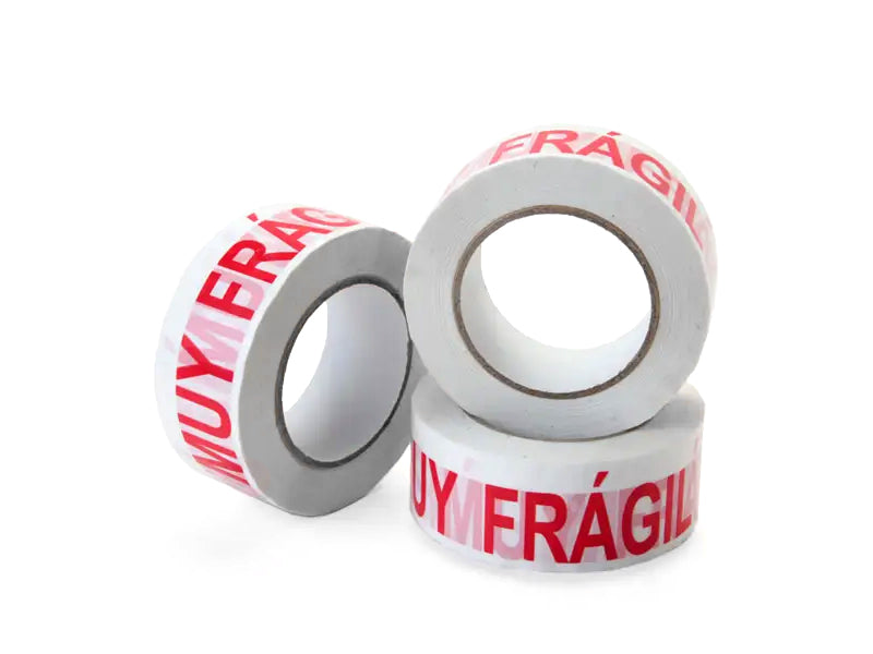 Cinta adhesiva impresa con el texto "MUY FRAGIL".